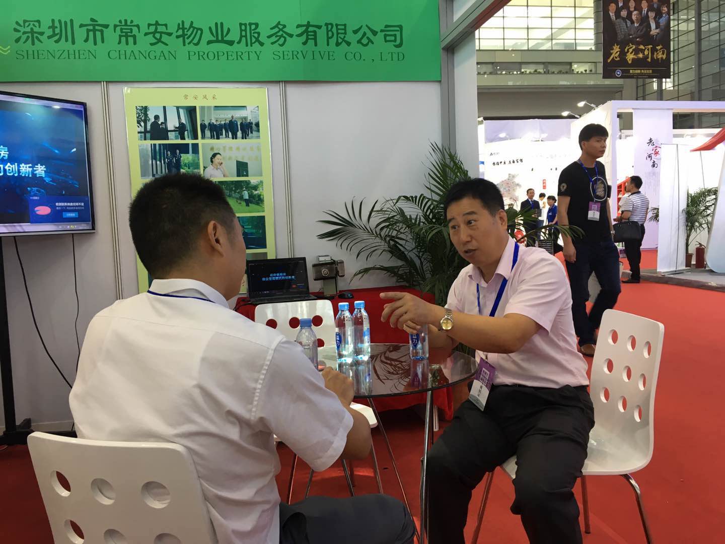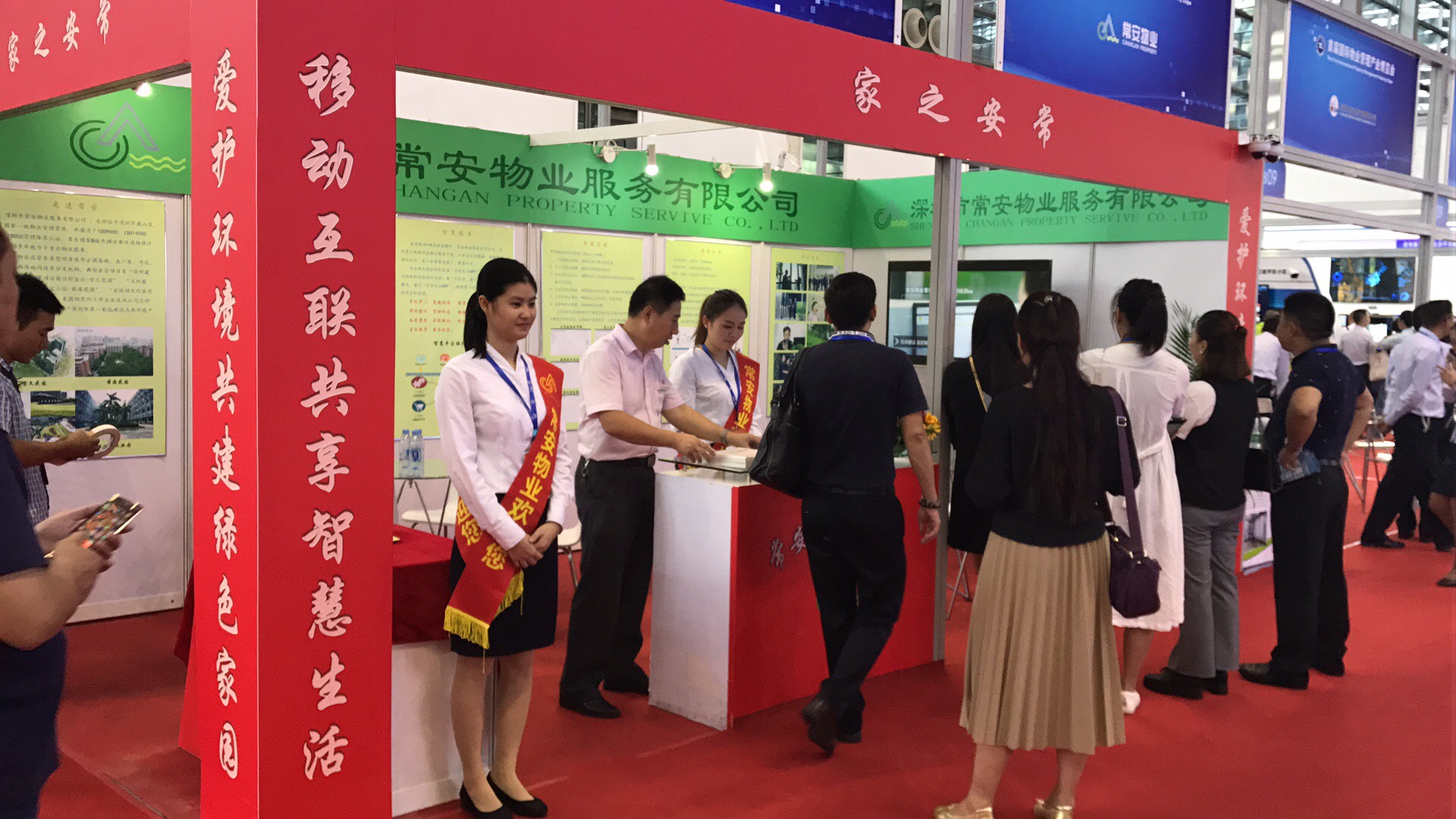 中國物業(yè)管理協(xié)會會長沈建忠及深圳市物業(yè)管理協(xié)會會長曹陽在常安物業(yè)公司展位前合影留戀