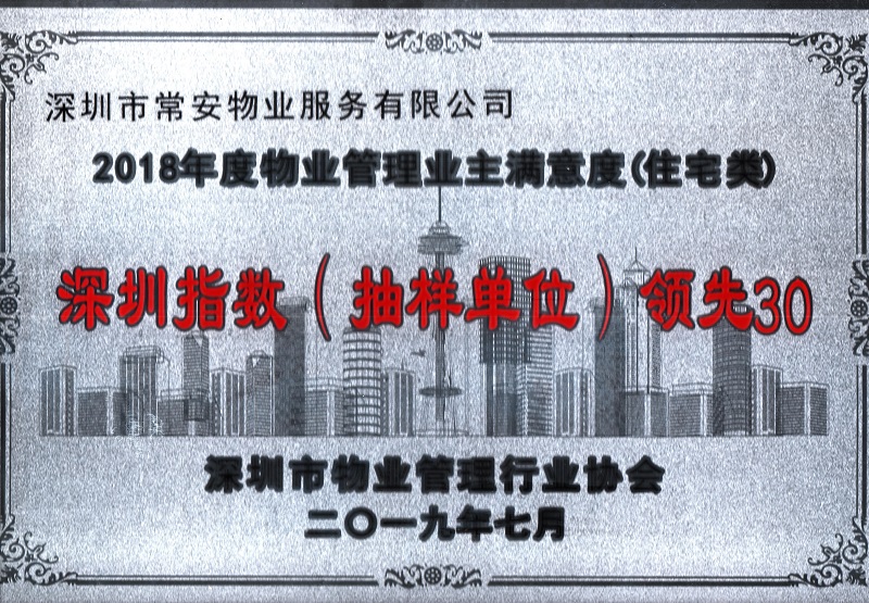 物業(yè)管理業(yè)主滿意度深圳指數(shù)測評工作已結(jié)束。以此次深圳指數(shù)測評所有樣本為主,結(jié)合深圳綜合實力 50強滿意度測評、優(yōu)秀項目達標驗收滿意度測評及自主參與滿意度測評所涉及的樣本進行統(tǒng)計,根據(jù)測評結(jié)果,我司榮獲“2018年度物業(yè)管理業(yè)主滿意度(住宅類)深圳指數(shù)(抽樣單位)領先30”的榮譽稱號。