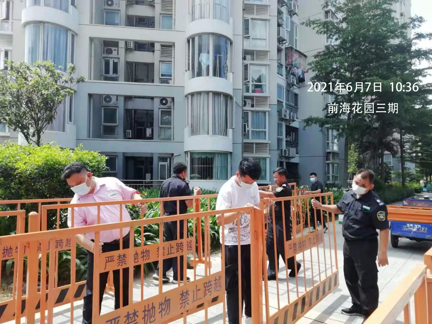 一、緊急協(xié)調(diào),布置圍擋。我司前?;▓@、崇文花園、百旺信高科技工業(yè)園、荔苑小區(qū)等多個服務中心接獲社區(qū)工作站通知的第一時間,各項目主任首當其沖、返回崗位,配合區(qū)防疫部門在小區(qū)/園區(qū)建立圍擋并開展新冠核酸檢測工作,并組織協(xié)調(diào)休假人員加入應急布置工作之中。