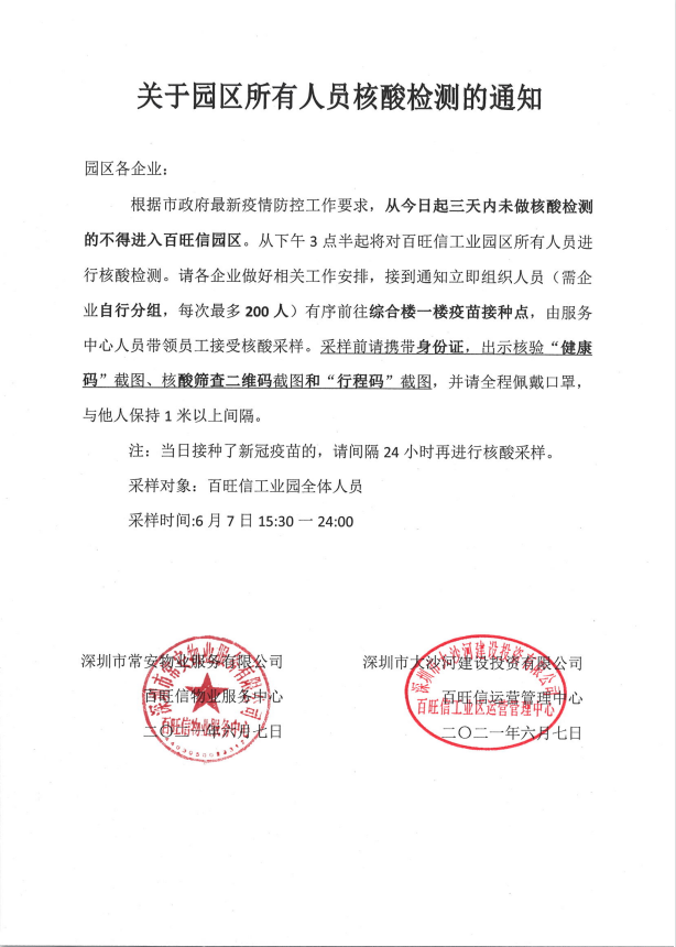 為響應我市關于疫情防控的最新要求,深圳市常安物業(yè)服務有限公司及下屬各服務中心全力配合南山區(qū)防疫部門、各轄區(qū)社區(qū)工作站全面覆蓋我司在管項目的核酸檢測工作。